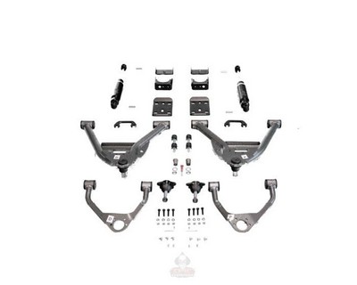 IHC Suspension’s 2014-2018 GM 1500 Single Cab 4/6 lowering kit consists of upper and lower control arms. You achieve the 4″ front drop with the lower control arm and the upper is for alignment correction. Spacers are included to adjust front control arms from 5” to 4” without purchasing any more parts. Shorter sway bar links are included for better sway bar angle. The rear consists of a flip kit with the correct pinion angle built-in, so no pinion shims are needed. Nitrogen drop shocks included.