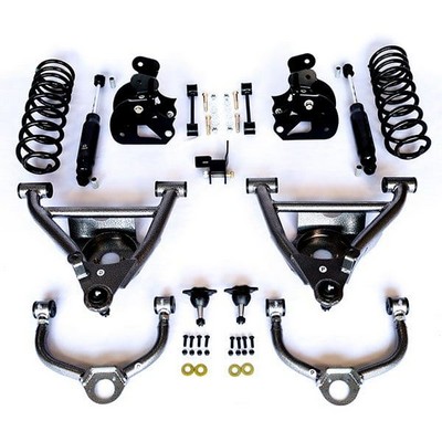 The rear is lowered with 4” progressive springs that are required to be trimmed from the topside to achieve 5”, 6”, or 7” drop. Keep in mind these are progressive springs and are the only springs in the industry that can be cut and will NOT affect ride quality. The dropdown trac bar bracket and shorter sway bar links are included to correct angles. The key feature of this kit is the 4 link relocation brackets. These brackets re-center the rear end to the fender well, correcting pinion angle. Eliminating high-speed wobble and swaying
